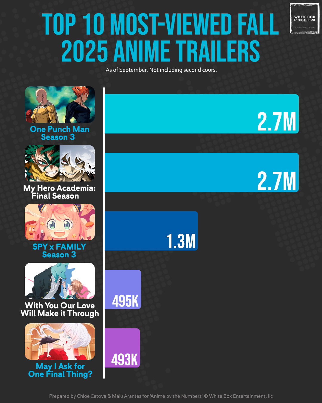 The big surprises in the top 5 trailers are With You, Our Love Will Make It Through (a shojo romance) and May I Ask For One Thing? (a josei comedy). As a shojosei enjoyer myself, I am happy to see these demographics getting more love, most likely because both series have “surprising” elements that drive social engagement. (Yes, one is the cute furry school romance, and the other is about the noble lady whose hobby is beating people up). - Chloe C.