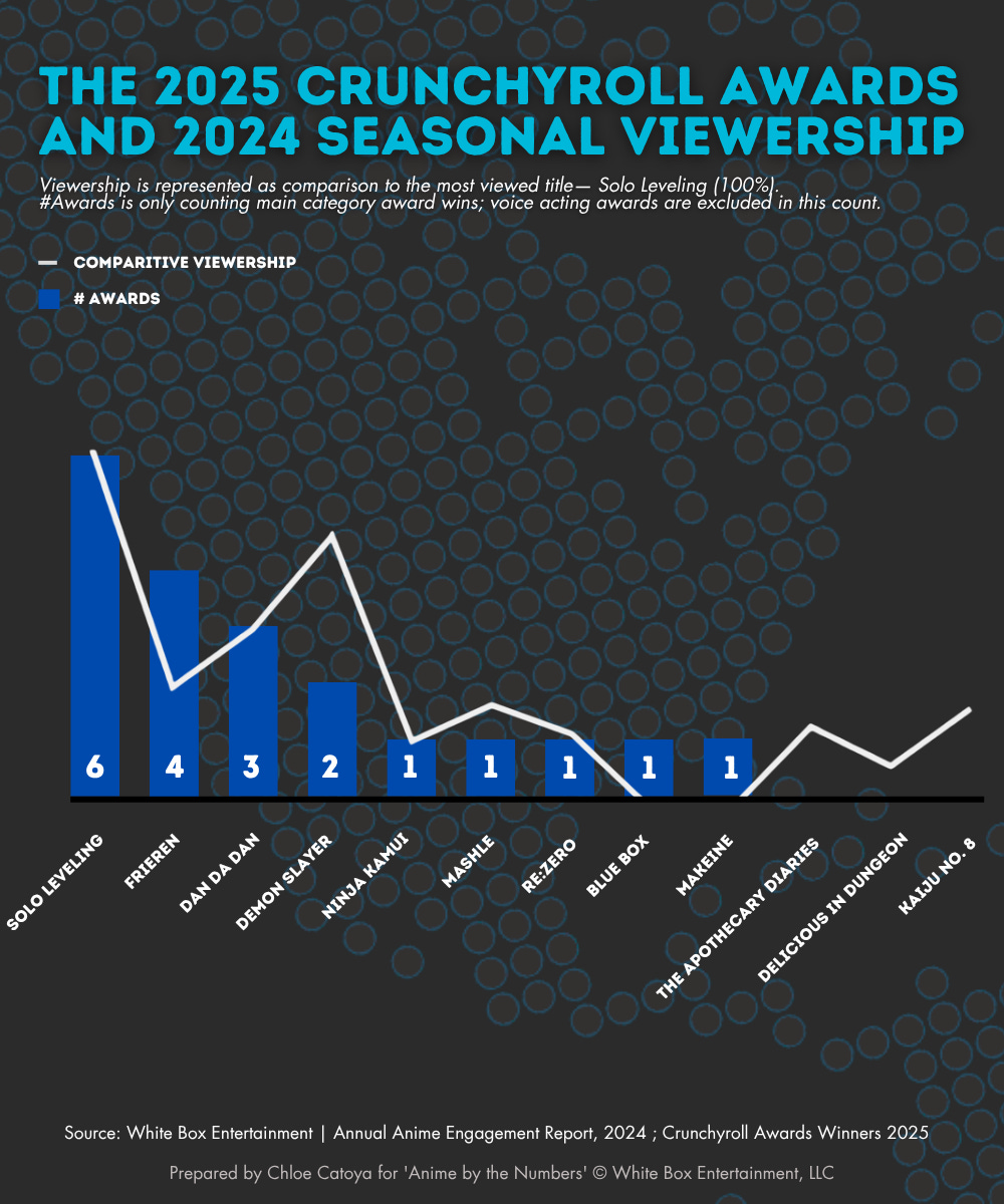 For example, if we look at the number of awards Frieren won and its comparative viewership, it won the 2nd most awards, despite having the 4th highest viewership for 2024. To me, this shows that even with fan voting, certain series can and will get recognition for specific elements that are top-of-class. However, this can’t always be guaranteed when voters cannot be held accountable to watch all series, let alone nominees, per season. I’d say there’s always next year, but unless things change, Solo Leveling season 2 will probably sweep for the 2026 awards. - Chloe C.